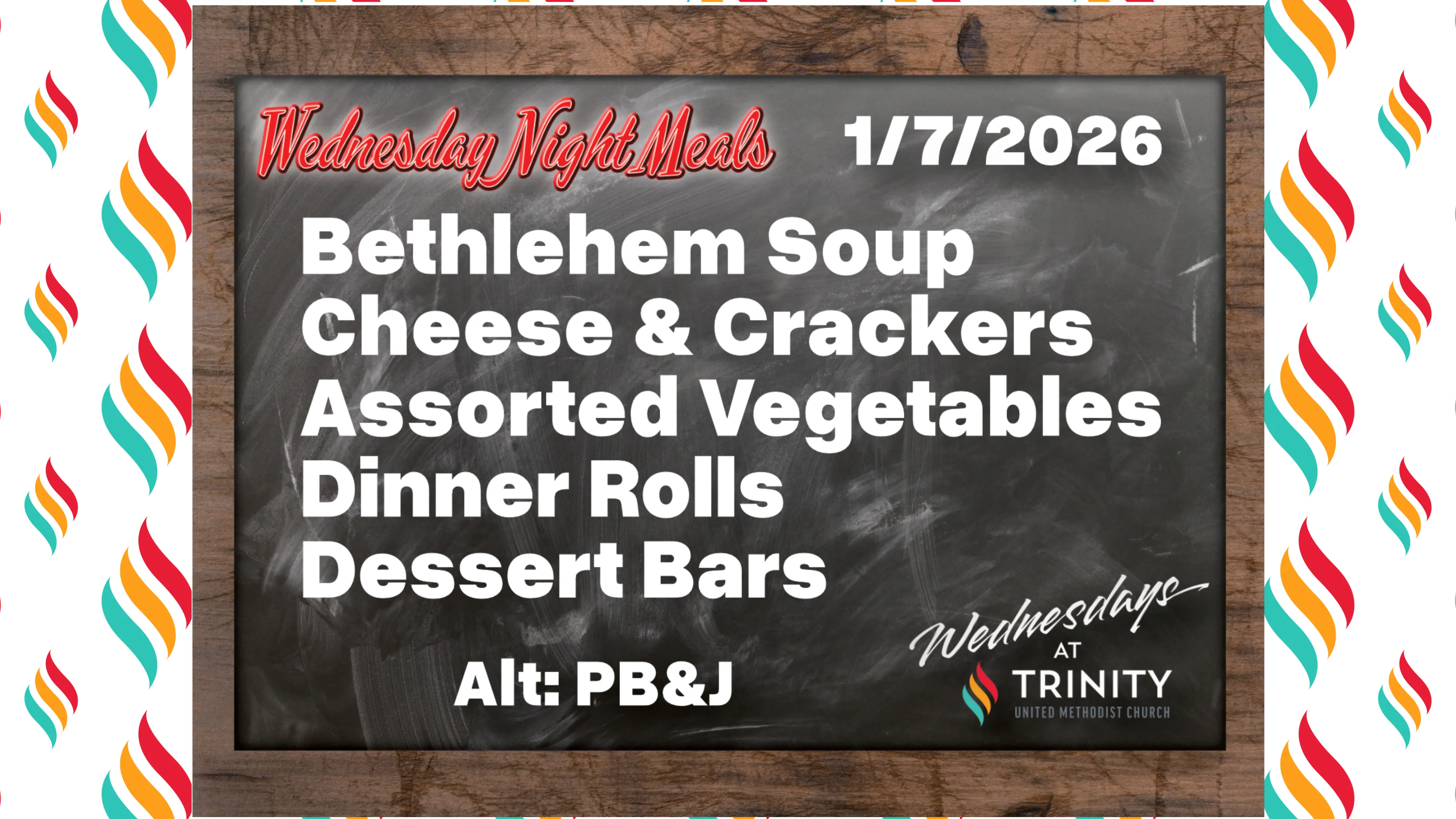 This is the Wednesday Night Meal menu for 01/07/2026: Bethlehem Soup, Cheese & Crackers, Assorted…