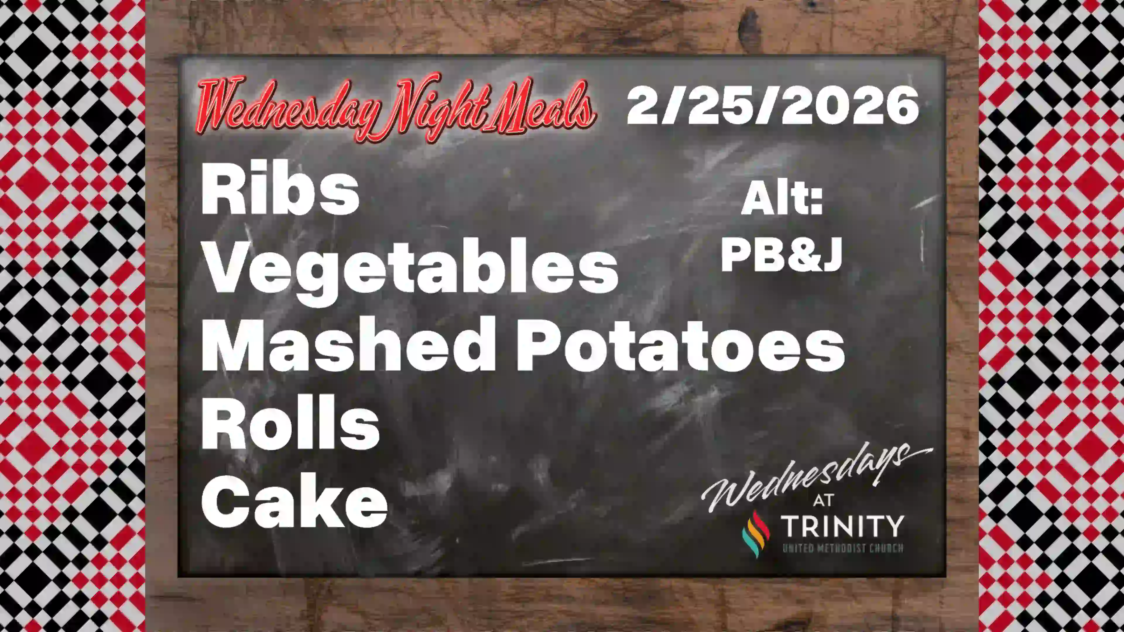 This is the Wednesday Night Meal menu for 02/25/2026: Ribs, Vegetables, Mashed Potatoes, Rolls, Cake.…